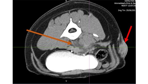 Left image: Orange area – fluid pocket ventral to spinal vertebrae, Red area – subcutaneous mass on left flank