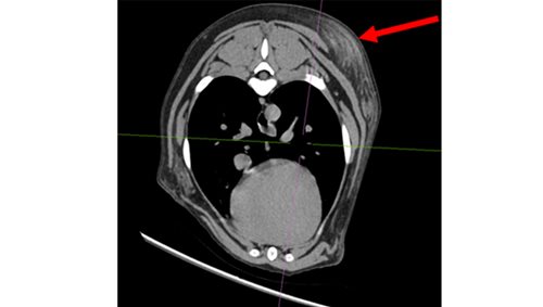 We decided to perform a positive contrast CT scan of the thorax, abdomen and pelvic limb. We also performed a sinogram: injection of contrast into the sinus to outline and define any communications of the draining sinus and a potential foreign body.